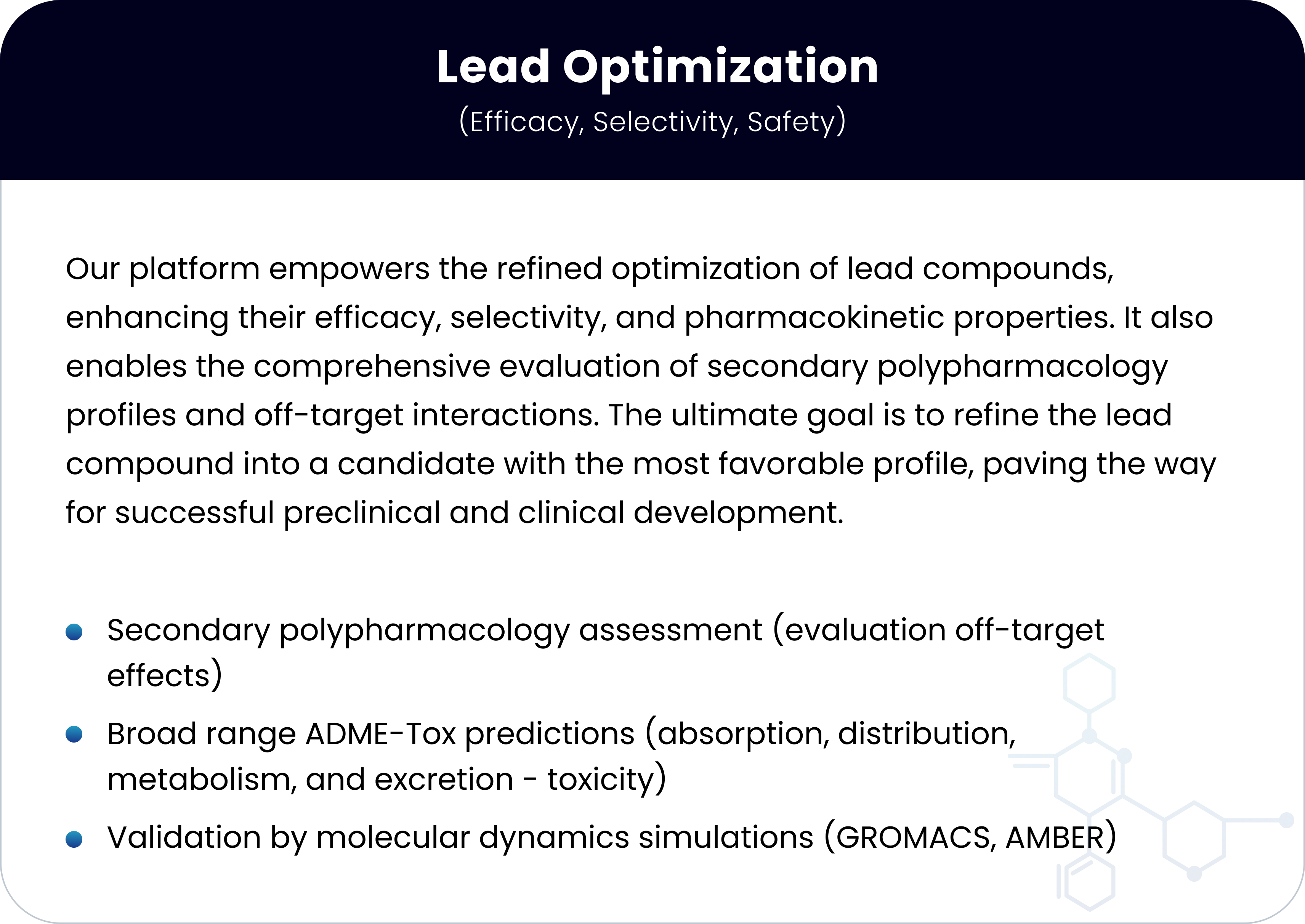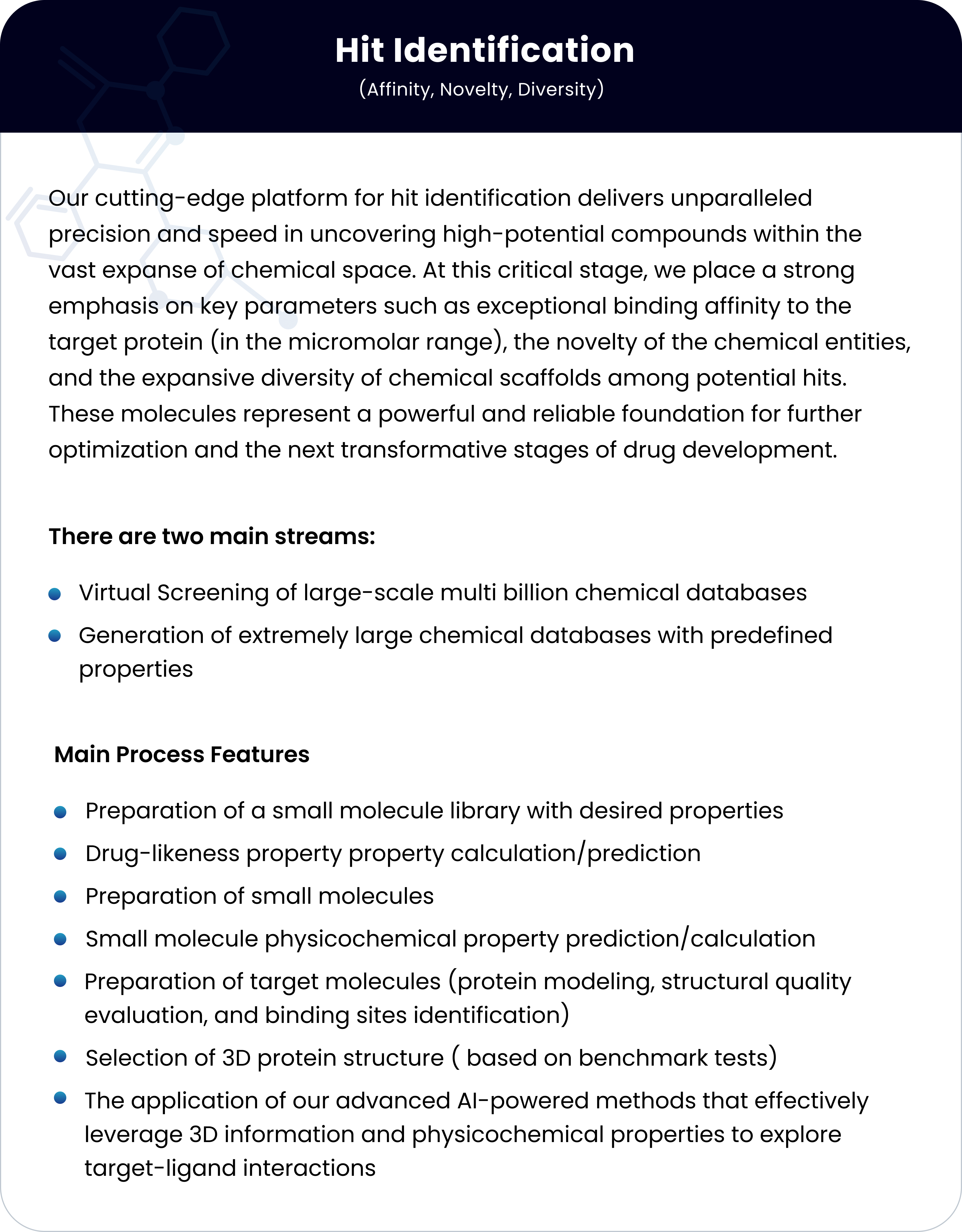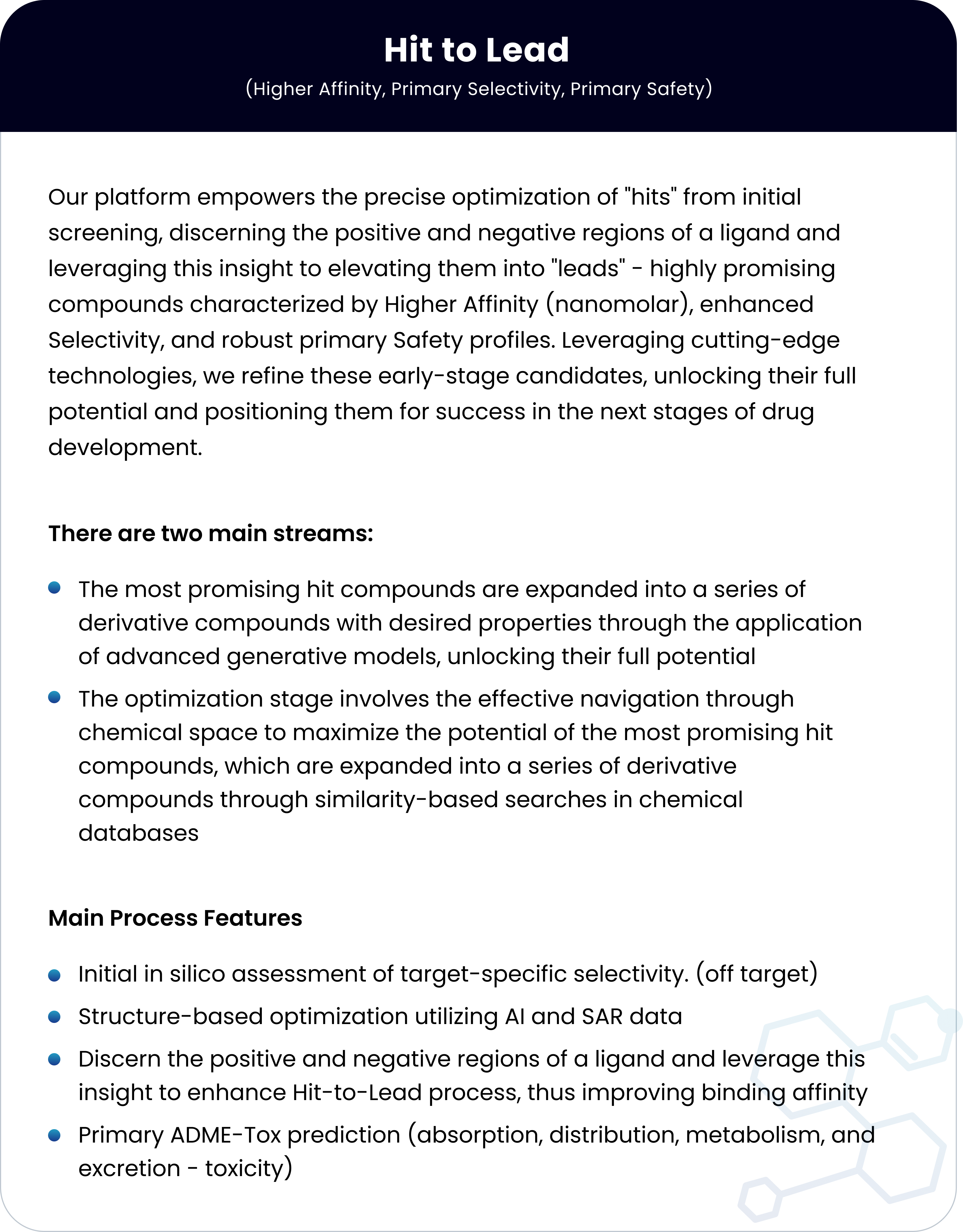 We provide end-to-end AI-powered in silico drug discovery services for pharma, biotech and academia that covers the main important aspects of the early stage drug discovery pipeline.